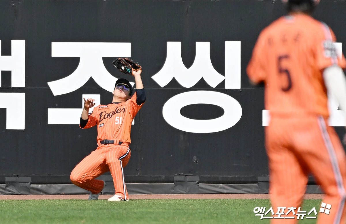 (엑스포츠뉴스 대전, 김한준 기자) 26일 오후 대전 한화생명 볼파크에서 열린 '2026 신한 SOL Bank KBO리그' NC 다이노스와 한화 이글스의 경기, 5회초 2사 한화 문현빈이 NC 고준휘의 타구를 잡고 있다.