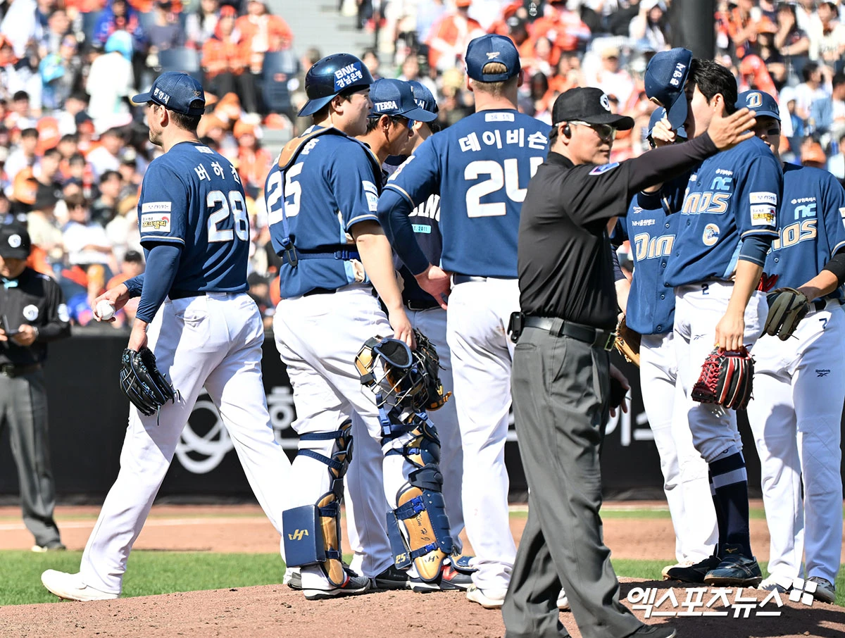 (엑스포츠뉴스 대전, 김한준 기자) 26일 오후 대전 한화생명 볼파크에서 열린 '2026 신한 SOL Bank KBO리그' NC 다이노스와 한화 이글스의 경기, 5회말 2사 1루 NC 선발투수 버하겐이 마운드를 내려가고 있다.