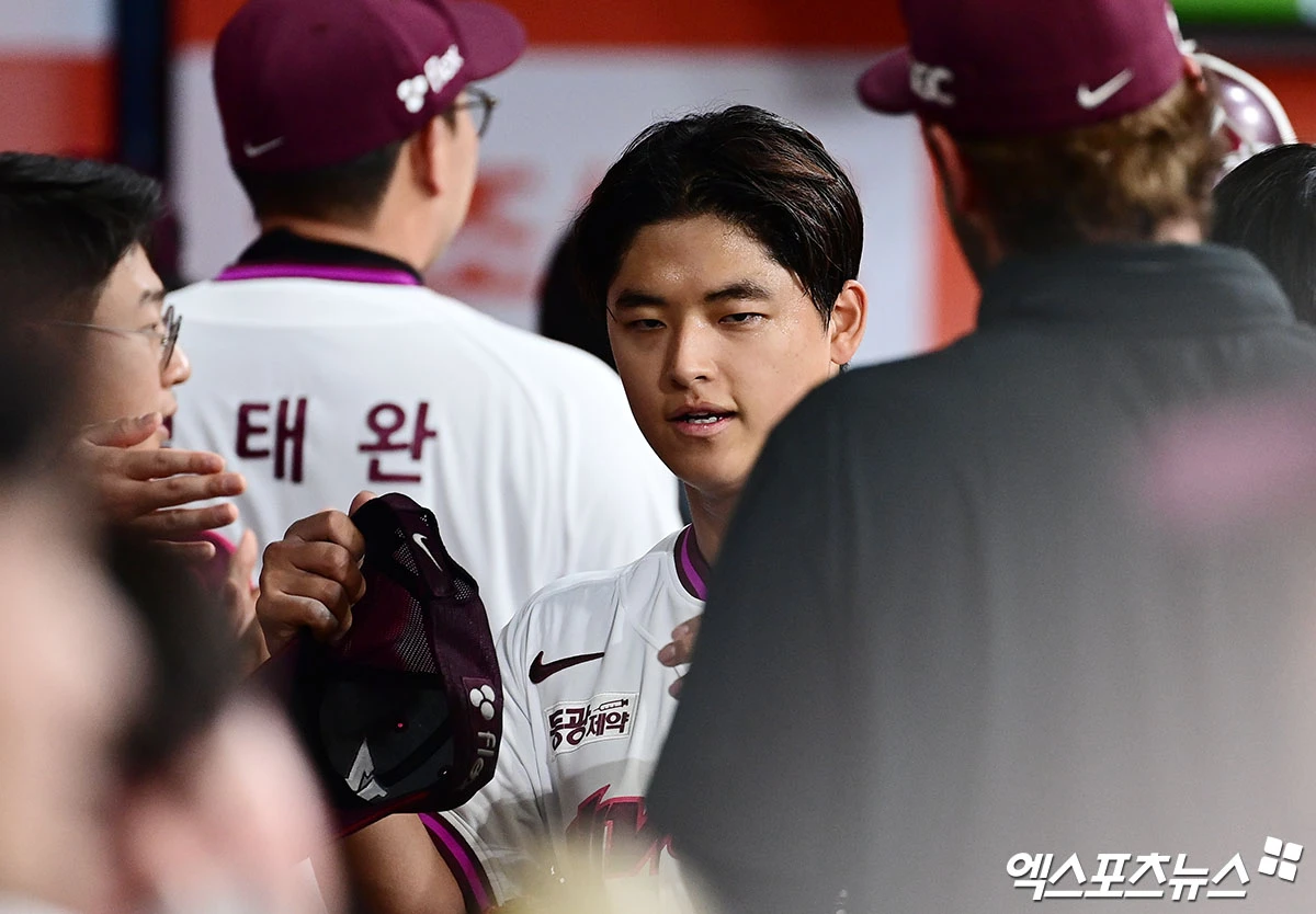(엑스포츠뉴스 고척, 박지영 기자) 26일 오후 서울 구로구 고척스카이돔에서 열린 '2026 신한 SOL Bank KBO 리그' 삼성 라이온즈와 키움 히어로즈의 경기, 5회초 2사 1,2루 키움 선발투수 박준현이 삼성 최형우를 내야 땅볼로 돌려세우며 이닝을 종료시킨 뒤 더그아웃에서 동료들과 하이파이브를 나누고 있다.
