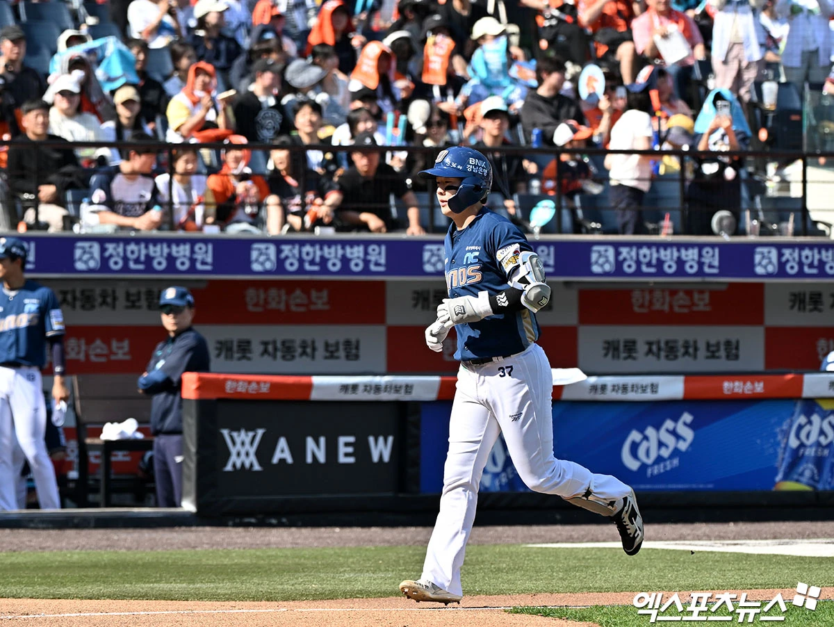 (엑스포츠뉴스 대전, 김한준 기자) 26일 오후 대전 한화생명 볼파크에서 열린 '2026 신한 SOL Bank KBO리그' NC 다이노스와 한화 이글스의 경기, 6회초 2사 NC 박건우가 솔로 홈런을 날린 후 기뻐하고 있다.