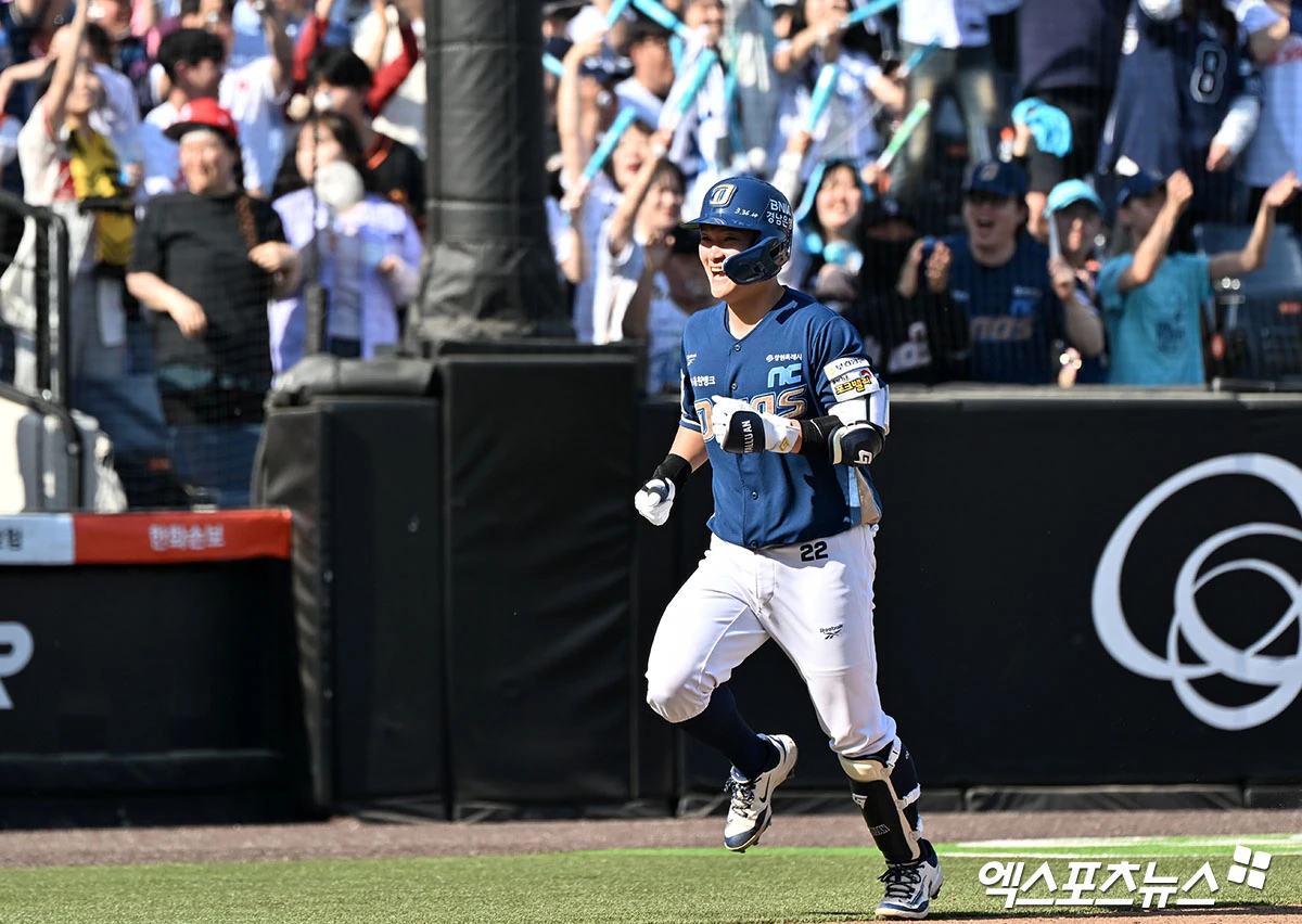 (엑스포츠뉴스 대전, 김한준 기자) 26일 오후 대전 한화생명 볼파크에서 열린 '2026 신한 SOL Bank KBO리그' NC 다이노스와 한화 이글스의 경기, 7회초 1사 1루 NC 안중열이 투런 홈런을 날린 후 기뻐하고 있다.