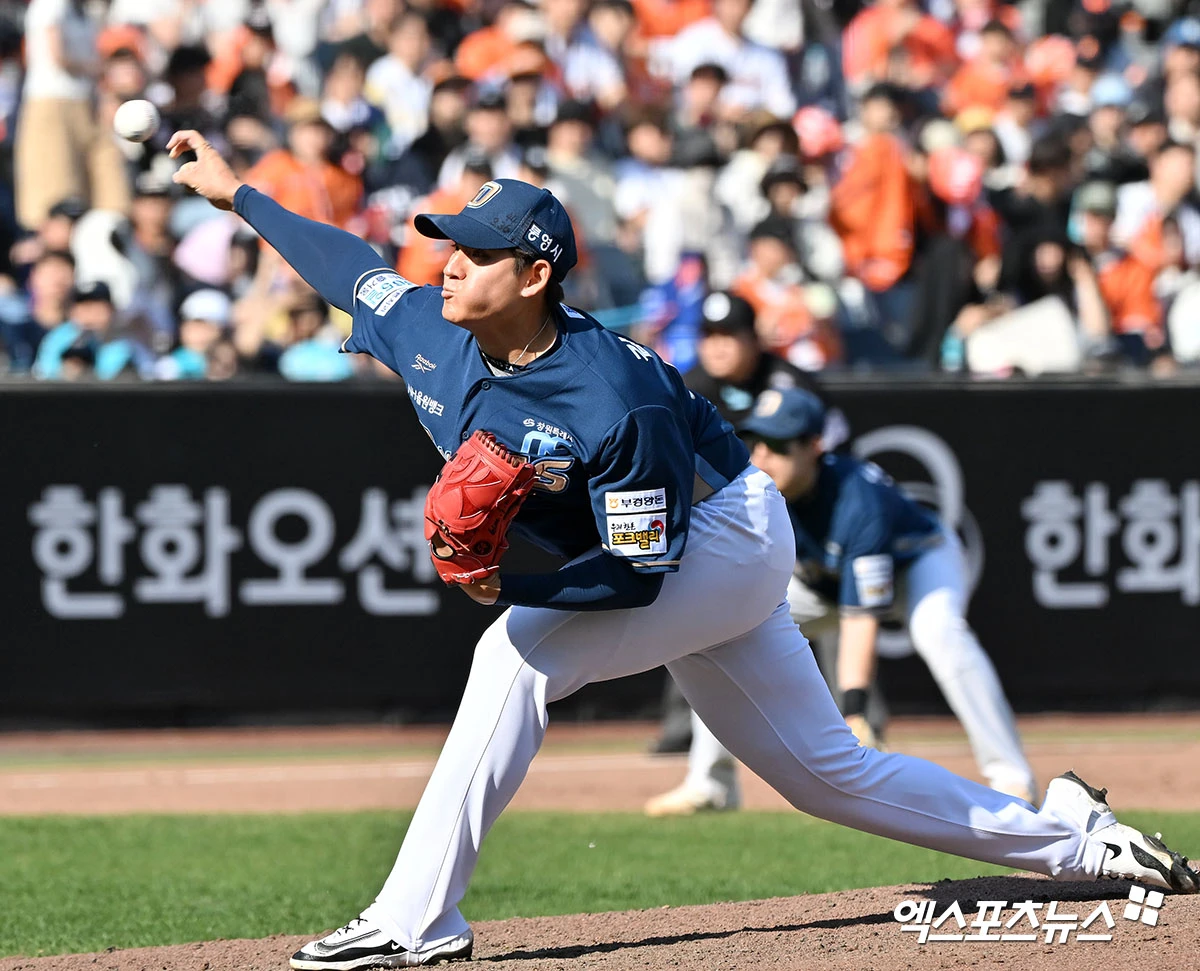 (엑스포츠뉴스 대전, 김한준 기자) 26일 오후 대전 한화생명 볼파크에서 열린 '2026 신한 SOL Bank KBO리그' NC 다이노스와 한화 이글스의 경기, 7회말 NC 김진호가 공을 힘차게 던지고 있다.
