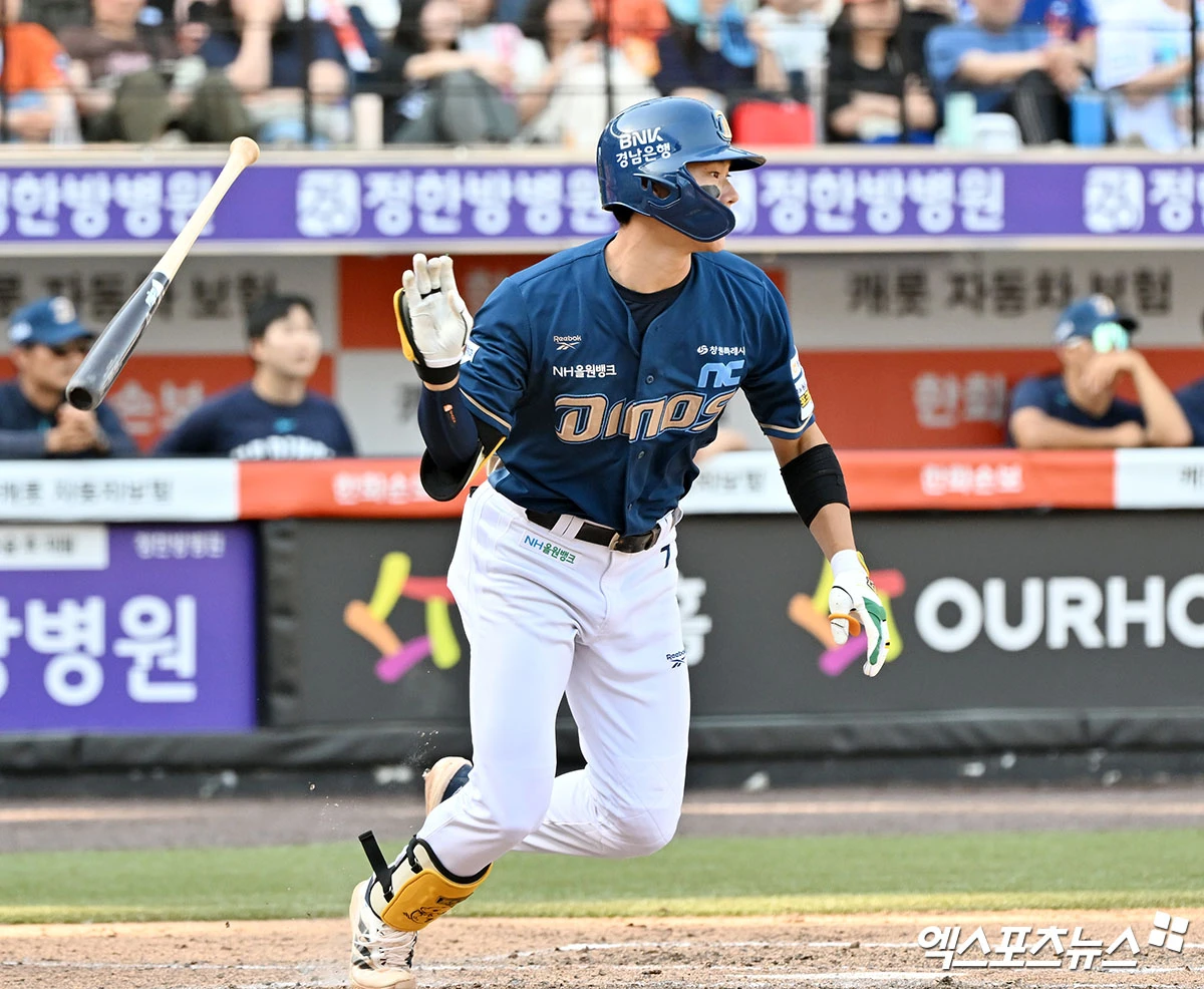 (엑스포츠뉴스 대전, 김한준 기자) 26일 오후 대전 한화생명 볼파크에서 열린 '2026 신한 SOL Bank KBO리그' NC 다이노스와 한화 이글스의 경기, 8회초 NC 김주원이 중전안타를 날리고 있다.