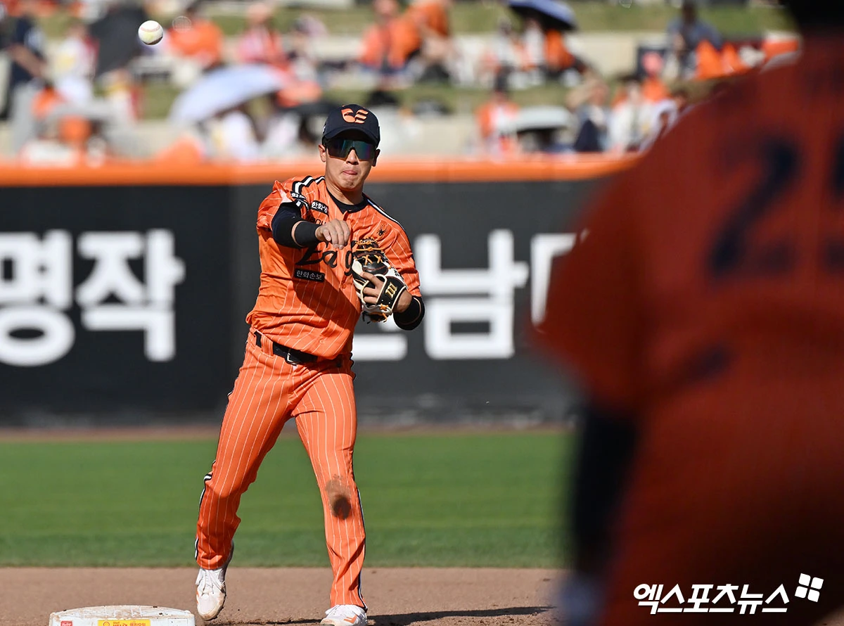 (엑스포츠뉴스 대전, 김한준 기자) 26일 오후 대전 한화생명 볼파크에서 열린 '2026 신한 SOL Bank KBO리그' NC 다이노스와 한화 이글스의 경기, 8회초 무사 1루 한화 황영묵이 NC 박민우의 내야땅볼때 김주원을 포스아웃 시킨 후 1루로 송구하고 있다.