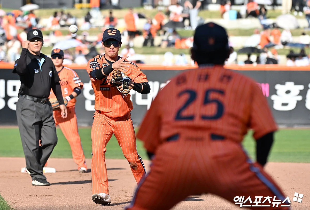 (엑스포츠뉴스 대전, 김한준 기자) 26일 오후 대전 한화생명 볼파크에서 열린 '2026 신한 SOL Bank KBO리그' NC 다이노스와 한화 이글스의 경기, 9회초 1사 1루 한화 황영묵이 NC 도태훈의 내야땅볼때 신재인을 태그아웃 시킨 후 1루로 송구하고 있다.