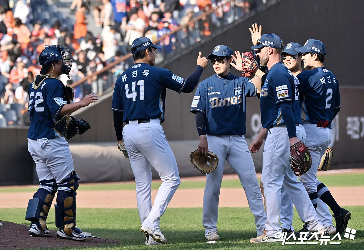 이날 경기에서 승리한 NC 선수들이 기뻐하고 있다.