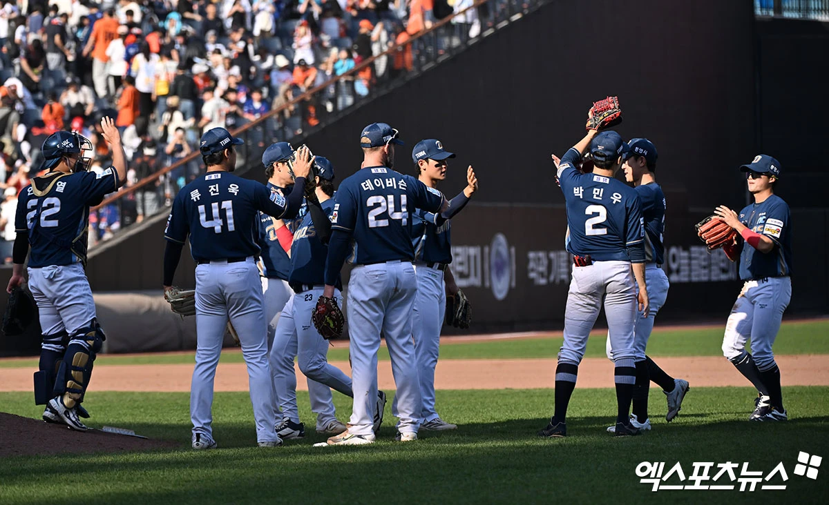 이날 경기에서 승리한 NC 선수들이 기뻐하고 있다.
