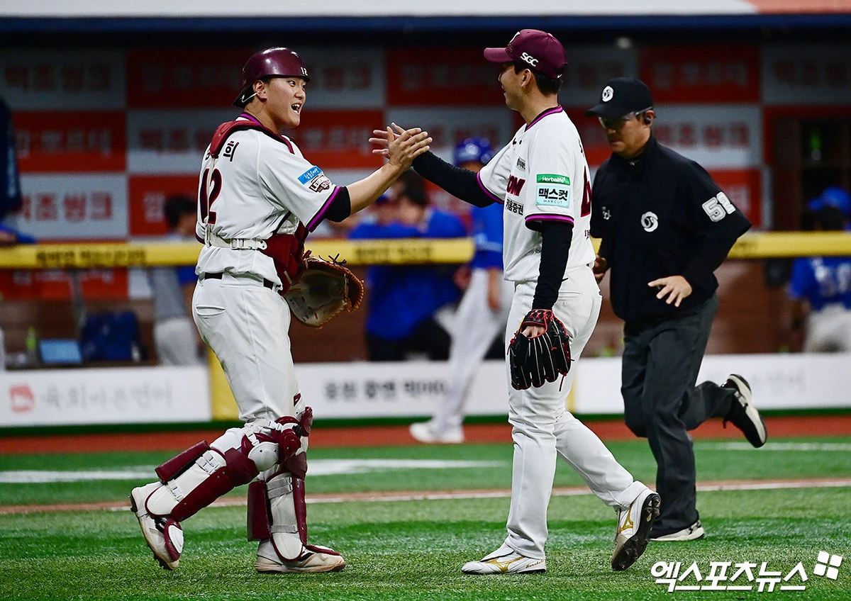 경기 종료 후 키움 김건희 유토 배터리가 승리의 기쁨을 나누고 있다.