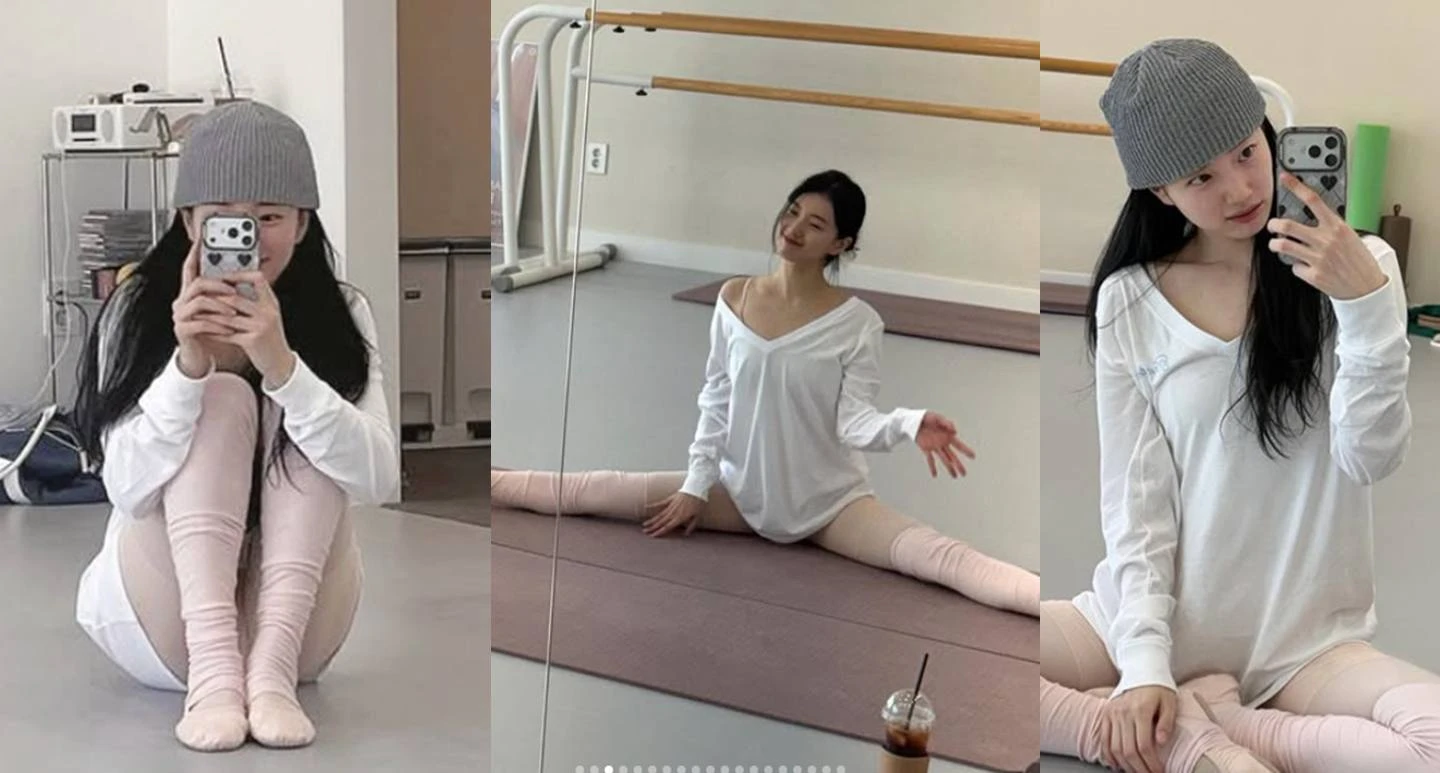 사진 속 수지는 발레복을 입고 바닥에 앉아 스트레칭을 하거나, 거울을 통해 셀카를 남기며 다양한 포즈를 취하고 있다. 특히 다리를 완전히 벌린 채 유연성을 드러낸 모습이 눈길을 끈다. 군살 없이 슬림한 몸매와 길게 뻗은 라인은 감탄을 자아낸다.
