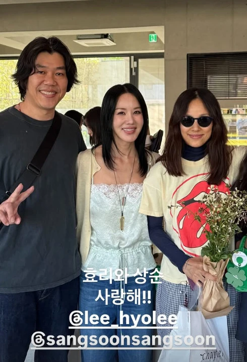 특히 이효리는 꾸민 듯 꾸미지 않은 ‘꾸안꾸’ 스타일로 시선을 사로잡았다. 프린팅 티셔츠에 슬림한 이너를 레이어드하고, 체크 패턴 하의와 선글라스를 매치해 특유의 힙한 분위기를 완성했다. 여기에 꽃다발을 들고 있는 모습까지 더해지며 자유롭고 감각적인 무드가 돋보인다. 특히 "효리와 상순 사랑해!!"라는 문구가 돋보였다.