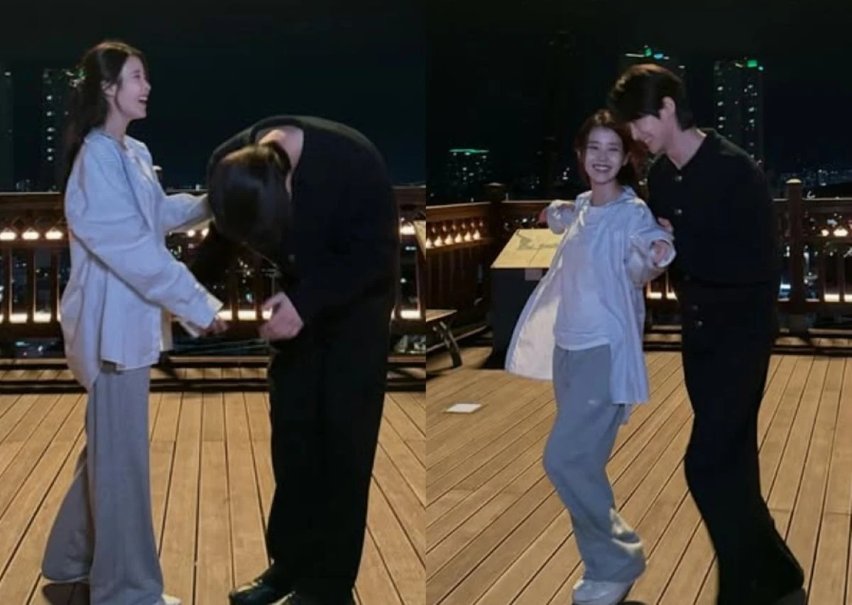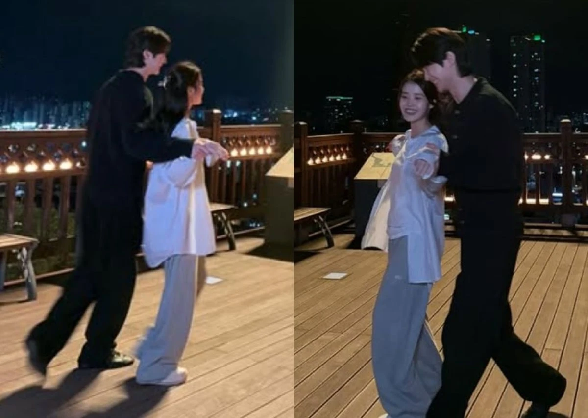 공개된 사진에는 MBC 금토드라마 '21세기 대군부인'에 출연 중인 아이유와 변우석이 건물 옥상에서 마주 보고 서 있는 모습이 담겼다.