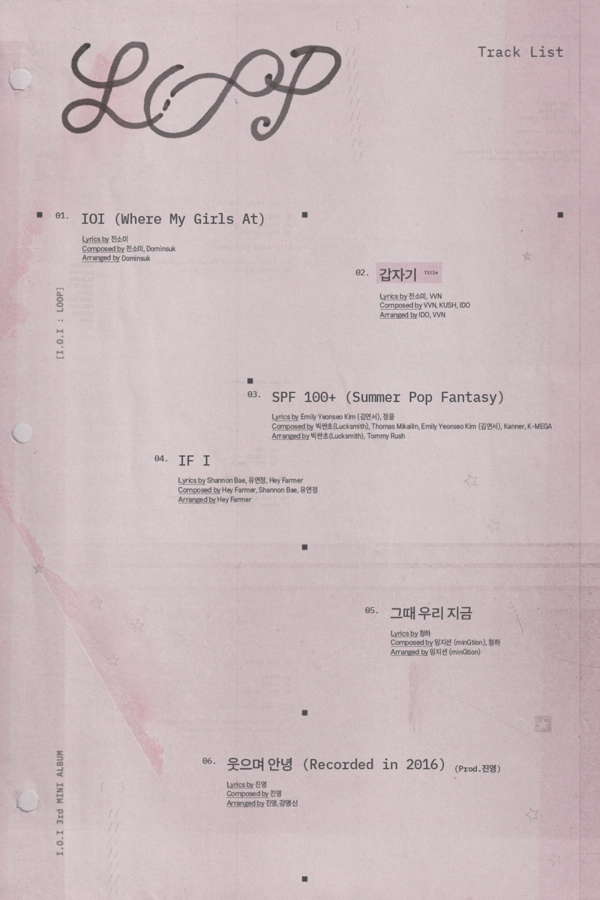 아이오아이(임나영, 청하, 김세정, 정채연, 김소혜, 유연정, 최유정, 김도연, 전소미)는 27일 자정 공식 SNS 채널을 통해 세 번째 미니앨범 'I.O.I : LOOP(아이오아이 : 루프)'의 트랙리스트 이미지를 게재했다.