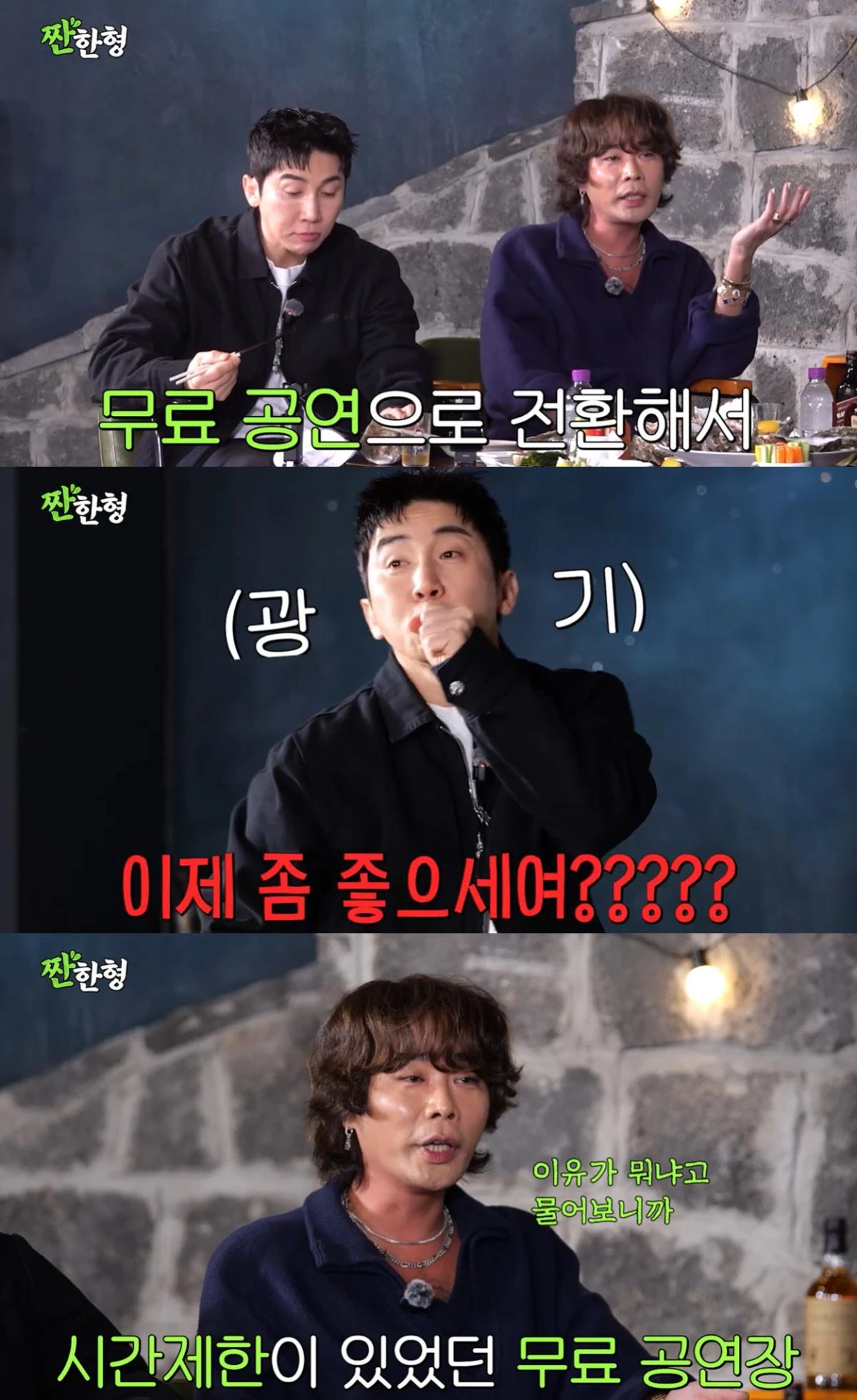 유세윤은 "저희가 공짜라고 오는 사람들보고 '으이그' 하고 손가락질을 했다. '이제 좀 좋으세요?' 했다. 욕을 해도 좋아하시더라. 멘트를 재밌게 했다. '거지 XX들과 함께 진행하고 있다. 소리 질러!' 하면 다 소리지르셨다"며 관객과 즐겼던 시간을 떠올렸다.