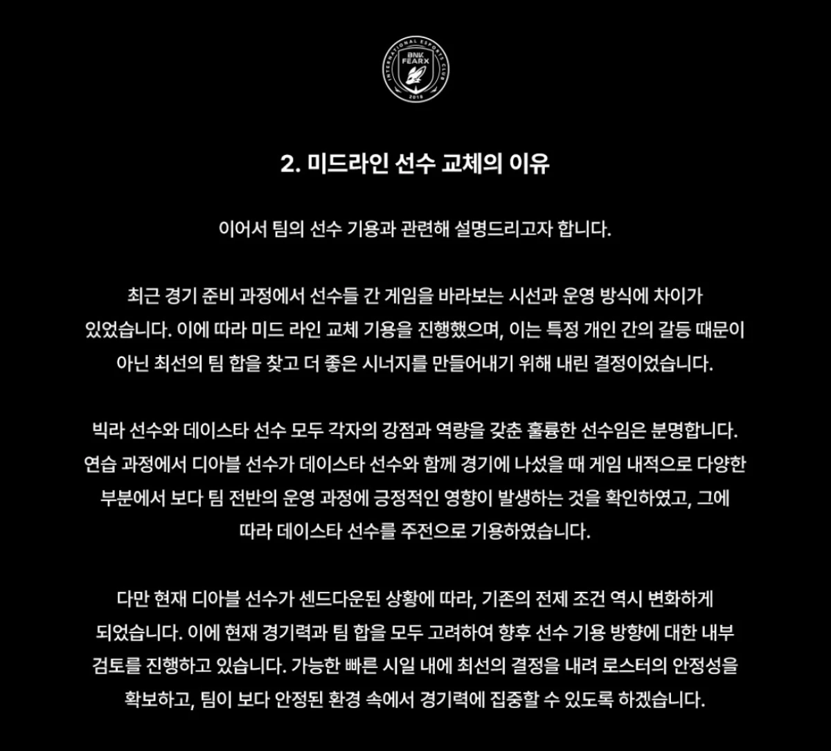 게임단은 "현재 퍼포먼스가 좋지 않아서가 아니라 프로 선수로서 갖춰야 할 태도와 책임감 측면에서 보완이 필요하다고 판단한 조치"라며 "2군 경기는 임시로 출전하지만 내부 징계 등 추가 조치가 있을 예정"이라고 덧붙였다. 또한 '디아블'이 팀 유스 시스템을 통해 성장해 온 상징적인 선수인 만큼 이번 결정이 받아들여지기 어려울 수 있다는 점도 충분히 인지하고 있다고 했다.