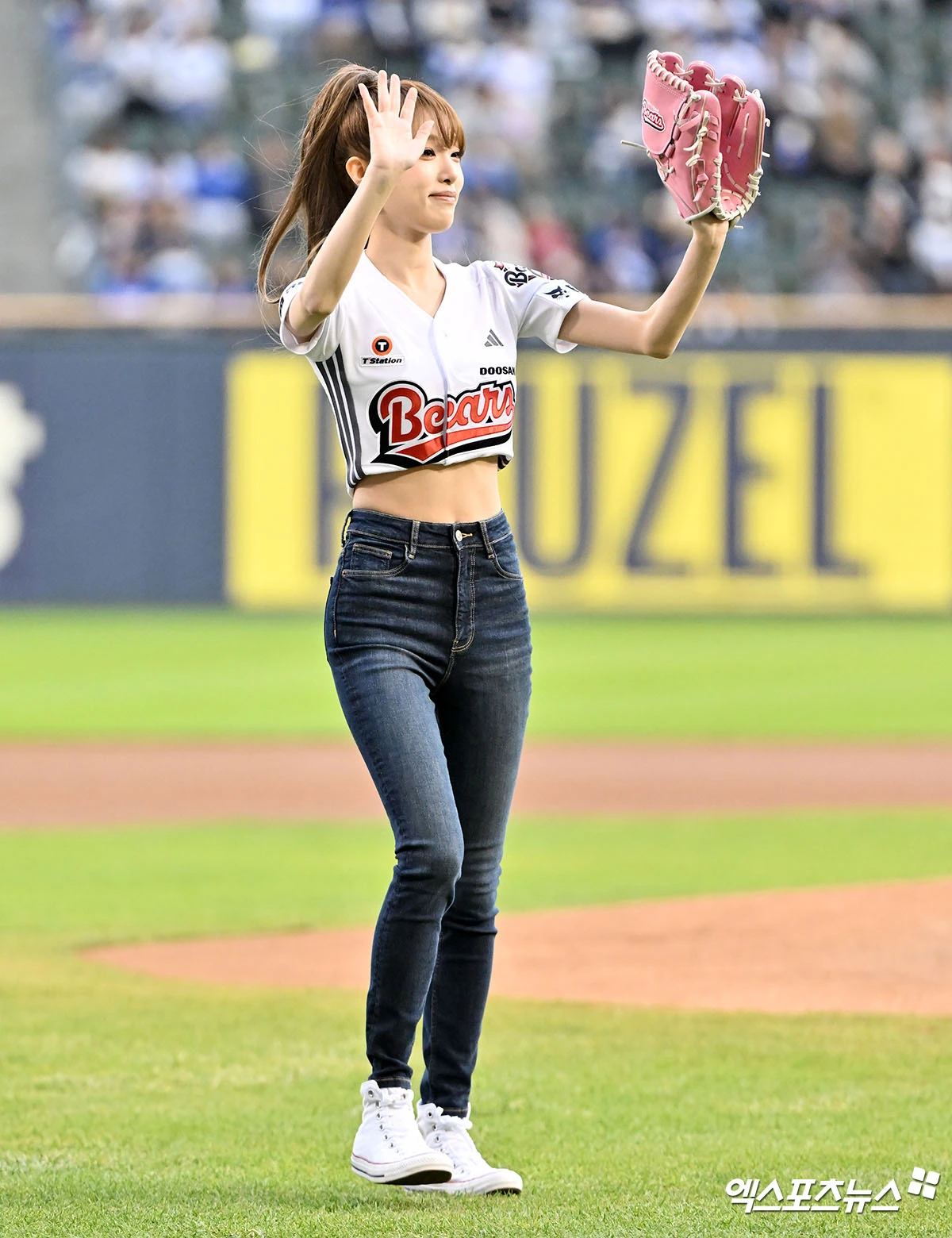 (엑스포츠뉴스 잠실, 김한준 기자) 28일 오후 서울 송파구 잠실야구장에서 열린 '2026 신한 SOL Bank KBO리그' 삼성 라이온즈와 두산 베어스의 경기, 경기 전 최예나가 시구에 임하고 있다.