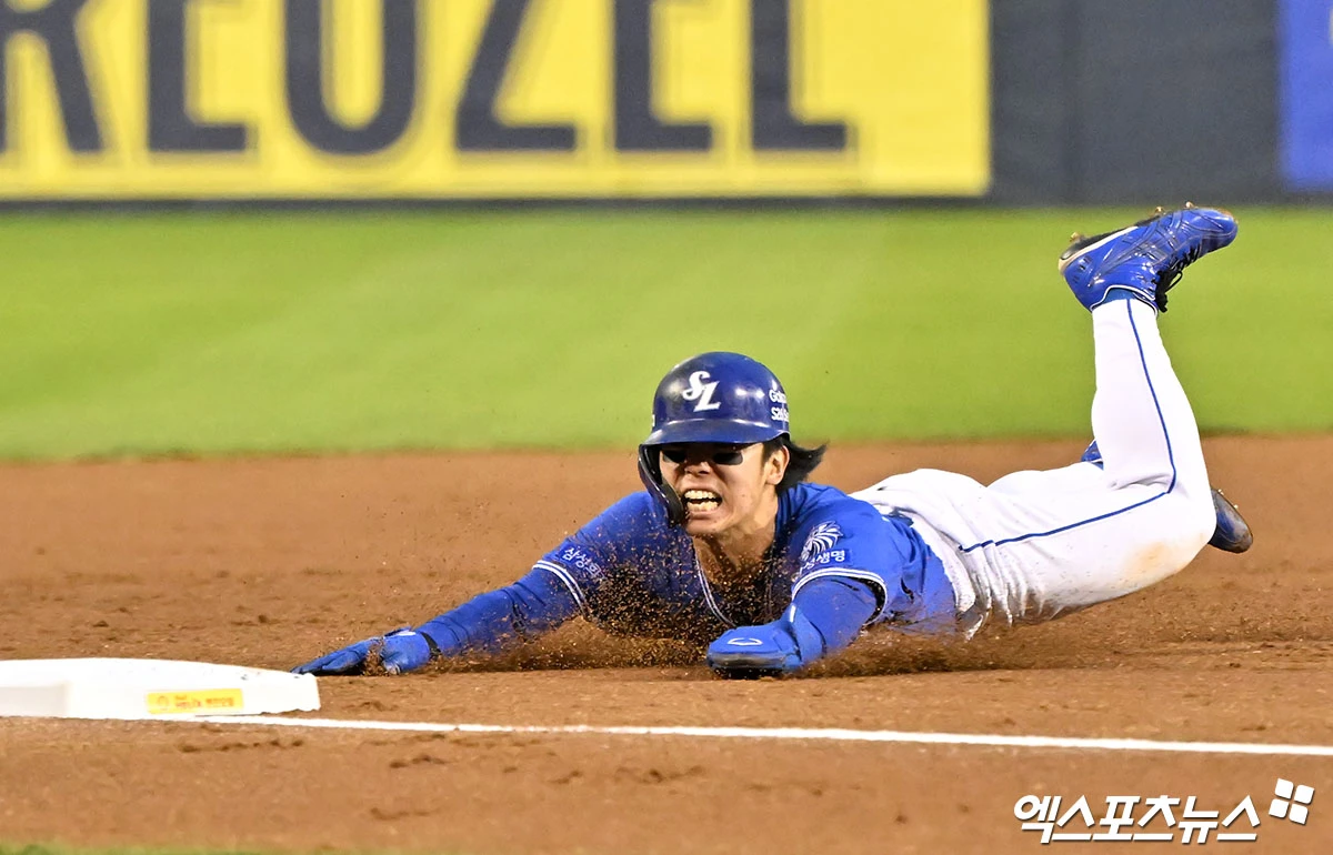 (엑스포츠뉴스 잠실, 김한준 기자) 28일 오후 서울 송파구 잠실야구장에서 열린 '2026 신한 SOL Bank KBO리그' 삼성 라이온즈와 두산 베어스의 경기, 4회초 무사 1루 삼성 김성윤이 최형우의 우전안타때 3루까지 진루하고 있다.