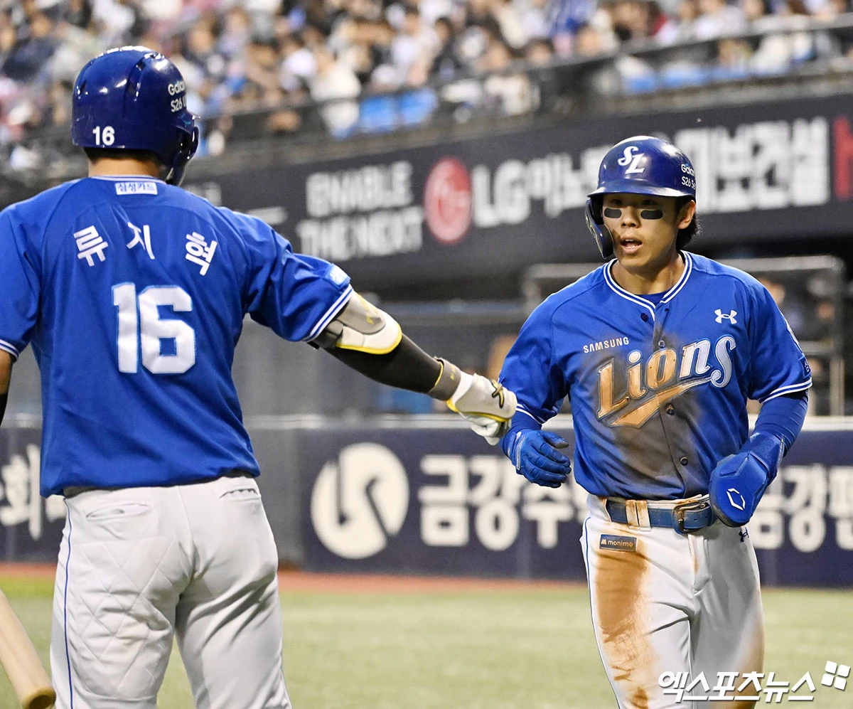(엑스포츠뉴스 잠실, 김한준 기자) 28일 오후 서울 송파구 잠실야구장에서 열린 '2026 신한 SOL Bank KBO리그' 삼성 라이온즈와 두산 베어스의 경기, 4회초 무사 2,3루 삼성 김성윤이 디아즈의 1타점 희생타때 태그업을 시도하며 득점에 성공하고 있다.