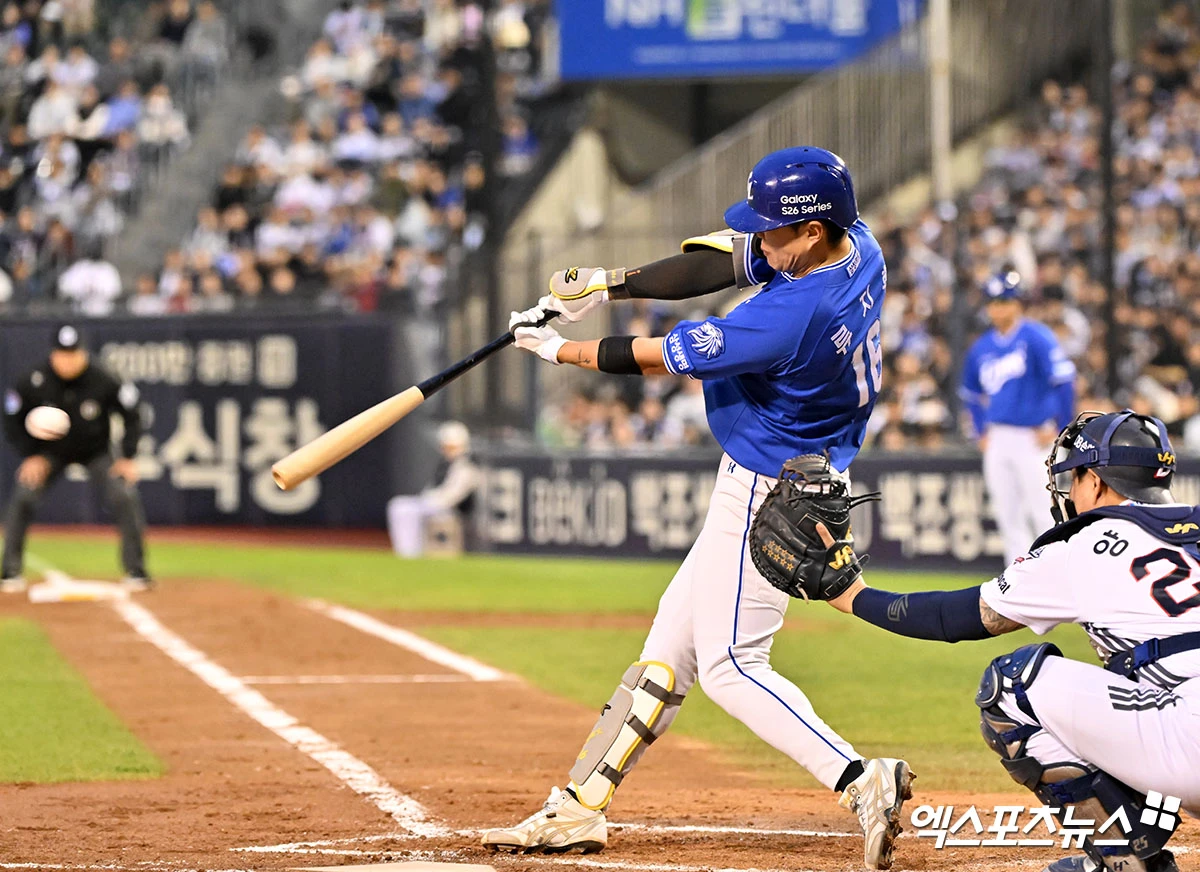 (엑스포츠뉴스 잠실, 김한준 기자) 28일 오후 서울 송파구 잠실야구장에서 열린 '2026 신한 SOL Bank KBO리그' 삼성 라이온즈와 두산 베어스의 경기, 4회초 1사 3루 삼성 류지혁이 1타점 적시타를 날리고 있다.