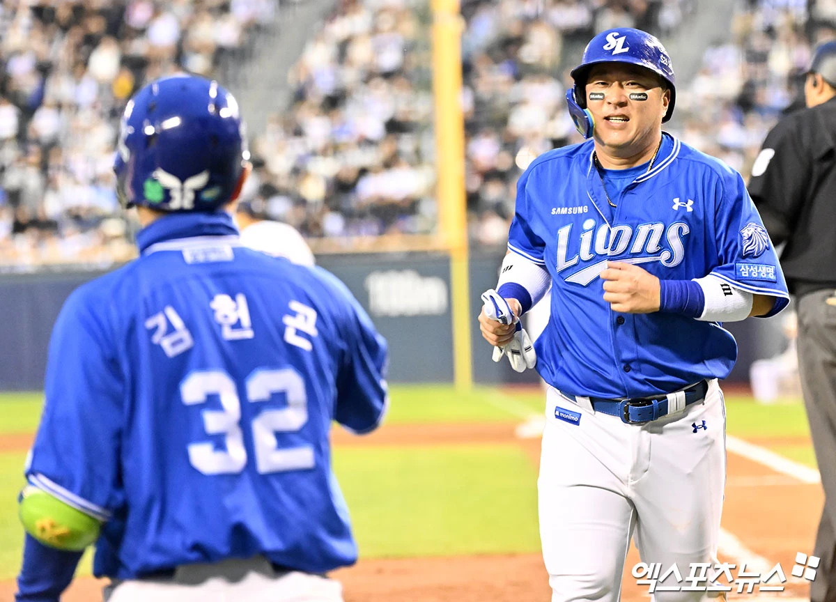 (엑스포츠뉴스 잠실, 김한준 기자) 28일 오후 서울 송파구 잠실야구장에서 열린 '2026 신한 SOL Bank KBO리그' 삼성 라이온즈와 두산 베어스의 경기, 4회초 1사 3루 삼성 최형우가 류지혁의 1타점 적시타때 득점에 성공하고 있다.
