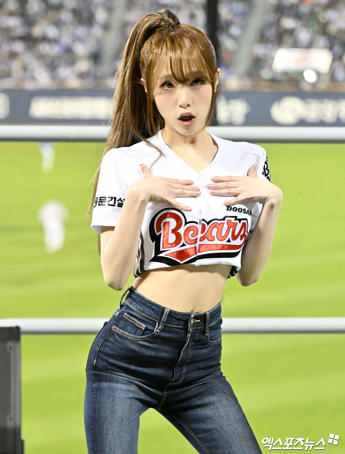 (엑스포츠뉴스 잠실, 김한준 기자) 28일 오후 서울 송파구 잠실야구장에서 열린 '2026 신한 SOL Bank KBO리그' 삼성 라이온즈와 두산 베어스의 경기, 클리닝타임때 가수 최예나가 멋진 공연을 선보이고 있다.