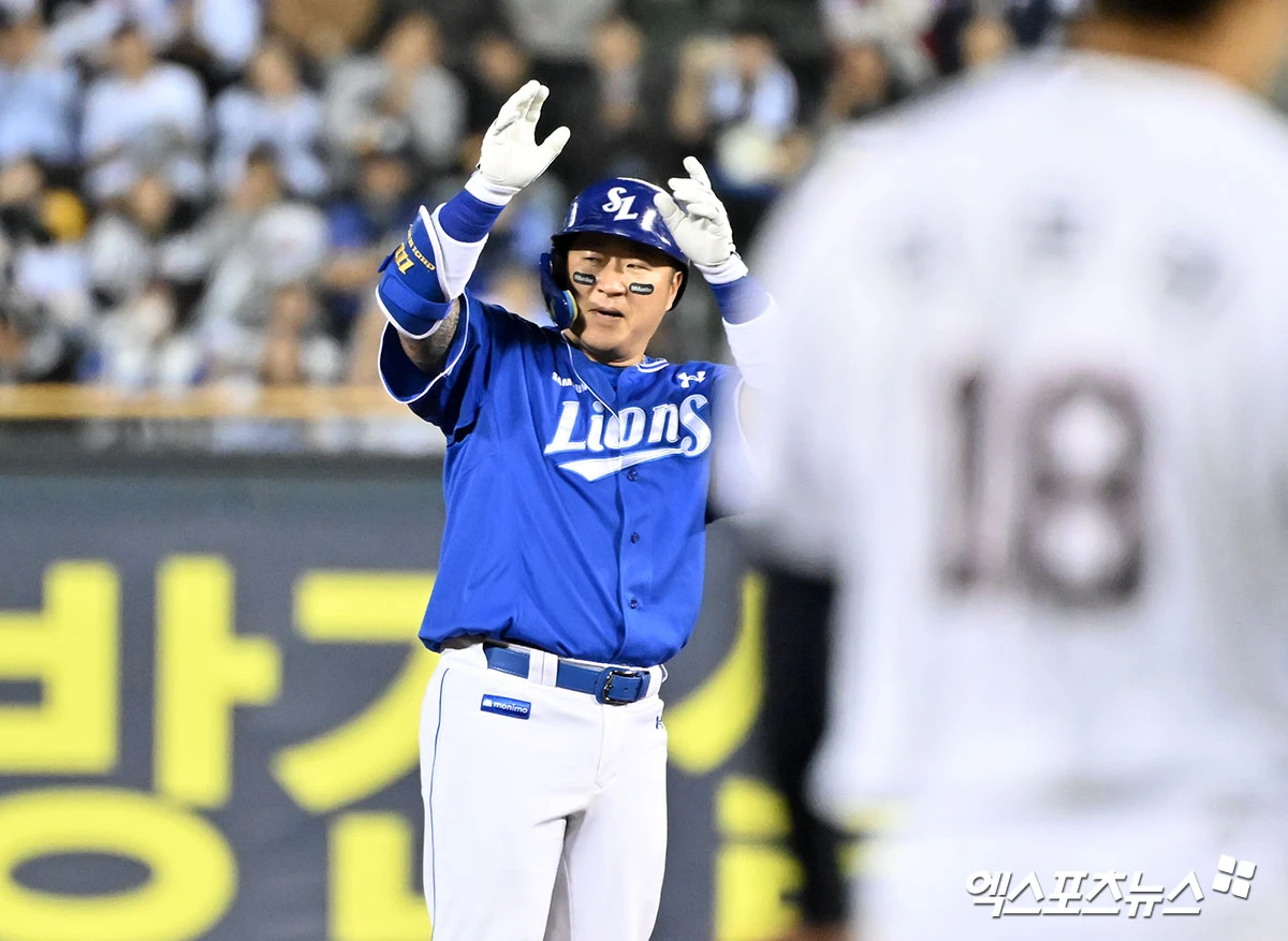 (엑스포츠뉴스 잠실, 김한준 기자) 28일 오후 서울 송파구 잠실야구장에서 열린 '2026 신한 SOL Bank KBO리그' 삼성 라이온즈와 두산 베어스의 경기, 8회초 1사 삼성 최형우가 2루타를 날리고 있다.