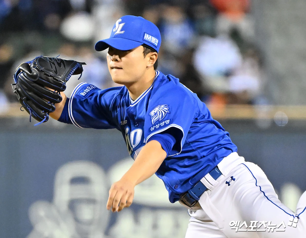 (엑스포츠뉴스 잠실, 김한준 기자) 28일 오후 서울 송파구 잠실야구장에서 열린 '2026 신한 SOL Bank KBO리그' 삼성 라이온즈와 두산 베어스의 경기, 9회말 무사 1,2루 삼성 이승민이 공을 힘차게 던지고 있다.