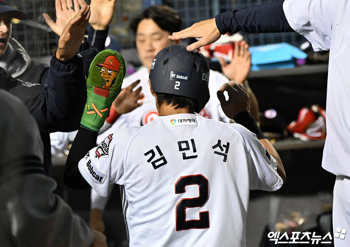 (엑스포츠뉴스 잠실, 김한준 기자) 28일 오후 서울 송파구 잠실야구장에서 열린 '2026 신한 SOL Bank KBO리그' 삼성 라이온즈와 두산 베어스의 경기, 9회말 1사 만루 두산 김민석이 박찬호의 1타점 적시타때 득점에 성공하고 있다.