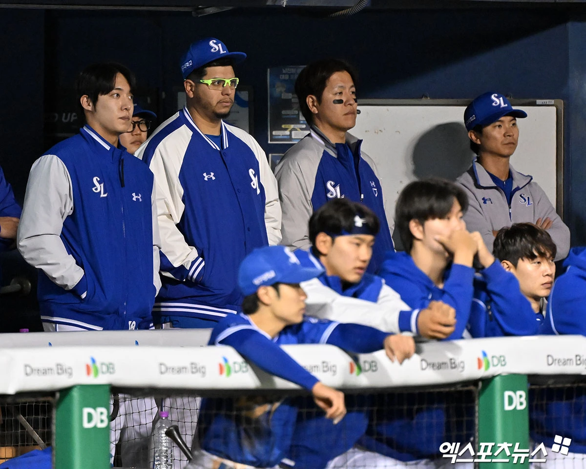 (엑스포츠뉴스 잠실, 김한준 기자) 28일 오후 서울 송파구 잠실야구장에서 열린 '2026 신한 SOL Bank KBO리그' 삼성 라이온즈와 두산 베어스의 경기, 9회말 삼성 후라도가 더그아웃에서 경기를 지켜보고 있다.