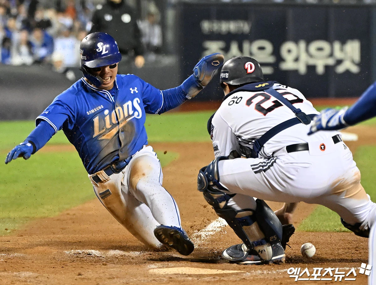 (엑스포츠뉴스 잠실, 김한준 기자) 28일 오후 서울 송파구 잠실야구장에서 열린 '2026 신한 SOL Bank KBO리그' 삼성 라이온즈와 두산 베어스의 경기, 10회초 1사 2루 삼성 김성윤이 최형우의 1타점 적시타때 득점에 성공하고 있다.