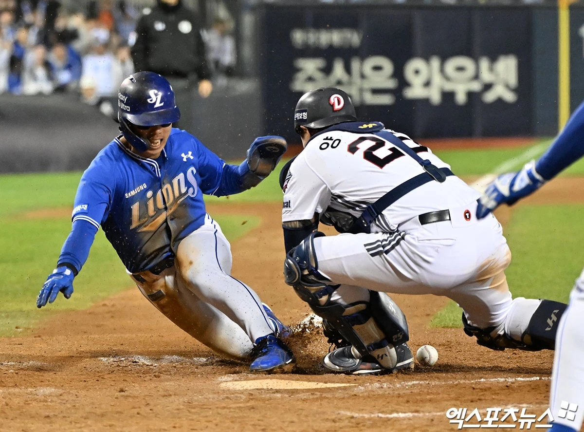 (엑스포츠뉴스 잠실, 김한준 기자) 28일 오후 서울 송파구 잠실야구장에서 열린 '2026 신한 SOL Bank KBO리그' 삼성 라이온즈와 두산 베어스의 경기, 10회초 1사 2루 삼성 김성윤이 최형우의 1타점 적시타때 득점에 성공하고 있다.