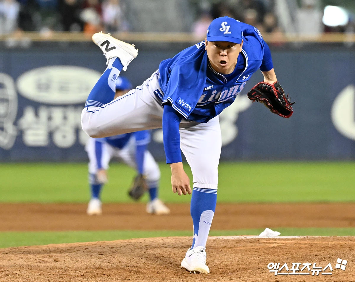 (엑스포츠뉴스 잠실, 김한준 기자) 28일 오후 서울 송파구 잠실야구장에서 열린 '2026 신한 SOL Bank KBO리그' 삼성 라이온즈와 두산 베어스의 경기, 10회말 삼성 이승현이 공을 힘차게 던지고 있다.
