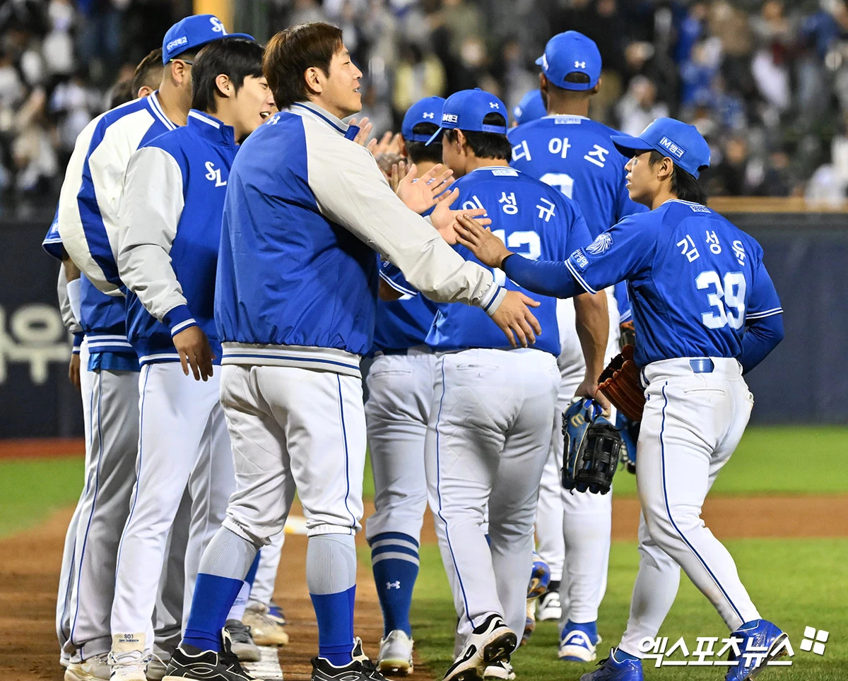 이날 경기에서 승리한 삼성 선수들이 기뻐하고 있다.
