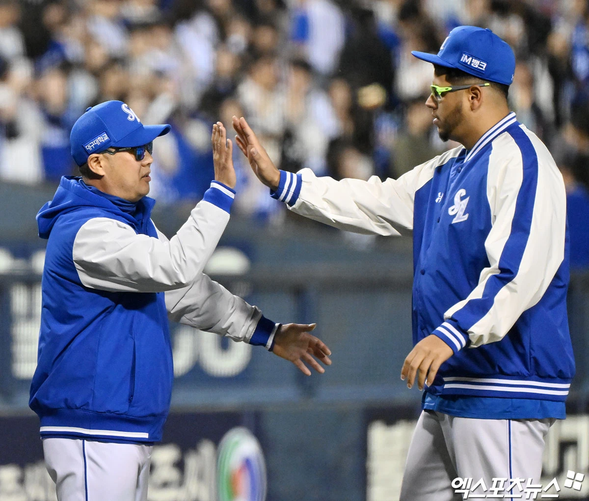이날 경기에서 승리한 삼성 박진만 감독이 후라도와 함께 기뻐하고 있다.