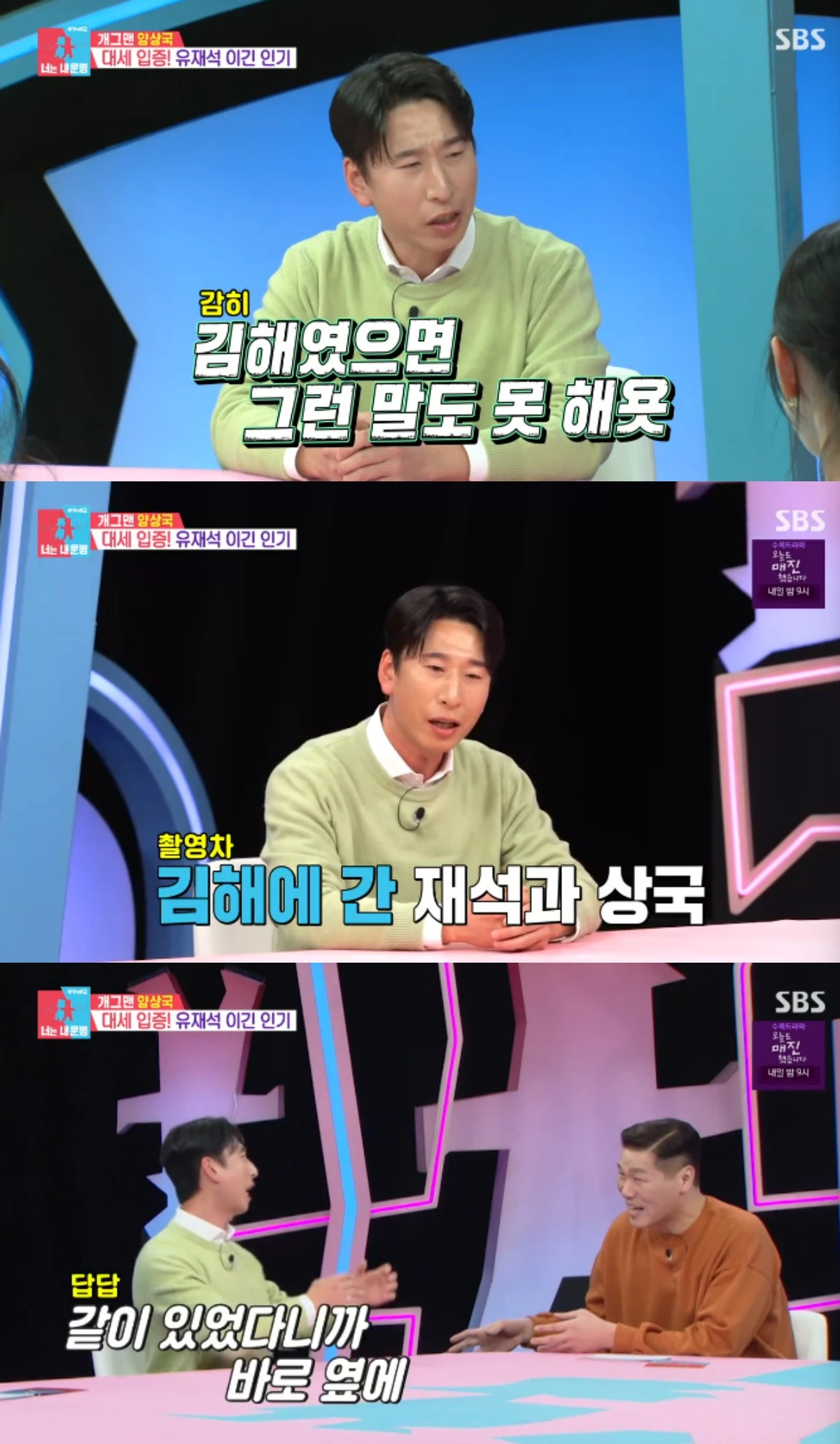 이에 양상국은 "김해에선 그런 말을 하면 큰일난다"고 발끈하면서 "유재석 선배랑 같이 김해에 갔더니 선배가 옆에 있는데도 저를 반겨주시더라"고 '김해의 유재석'임을 강조해 웃음을 자아냈다.