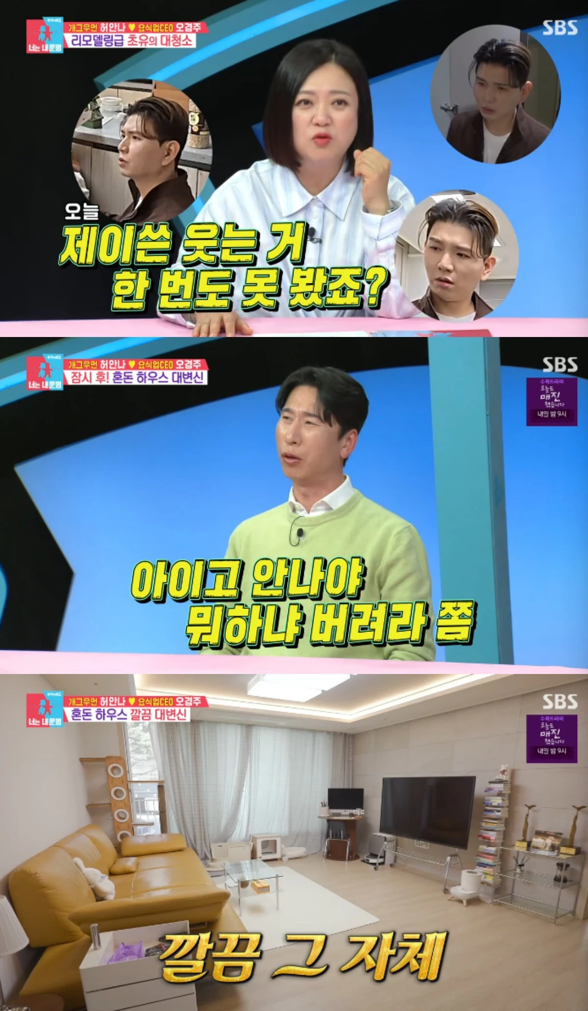 제이쓴은 엉망진창인 집 상태에 "좀 혼내도 되느냐"면서 "90%는 버려야 한다. 집을 비워야 뭐라도 들어오지 않겠냐. 무조건 버려라"고했다.