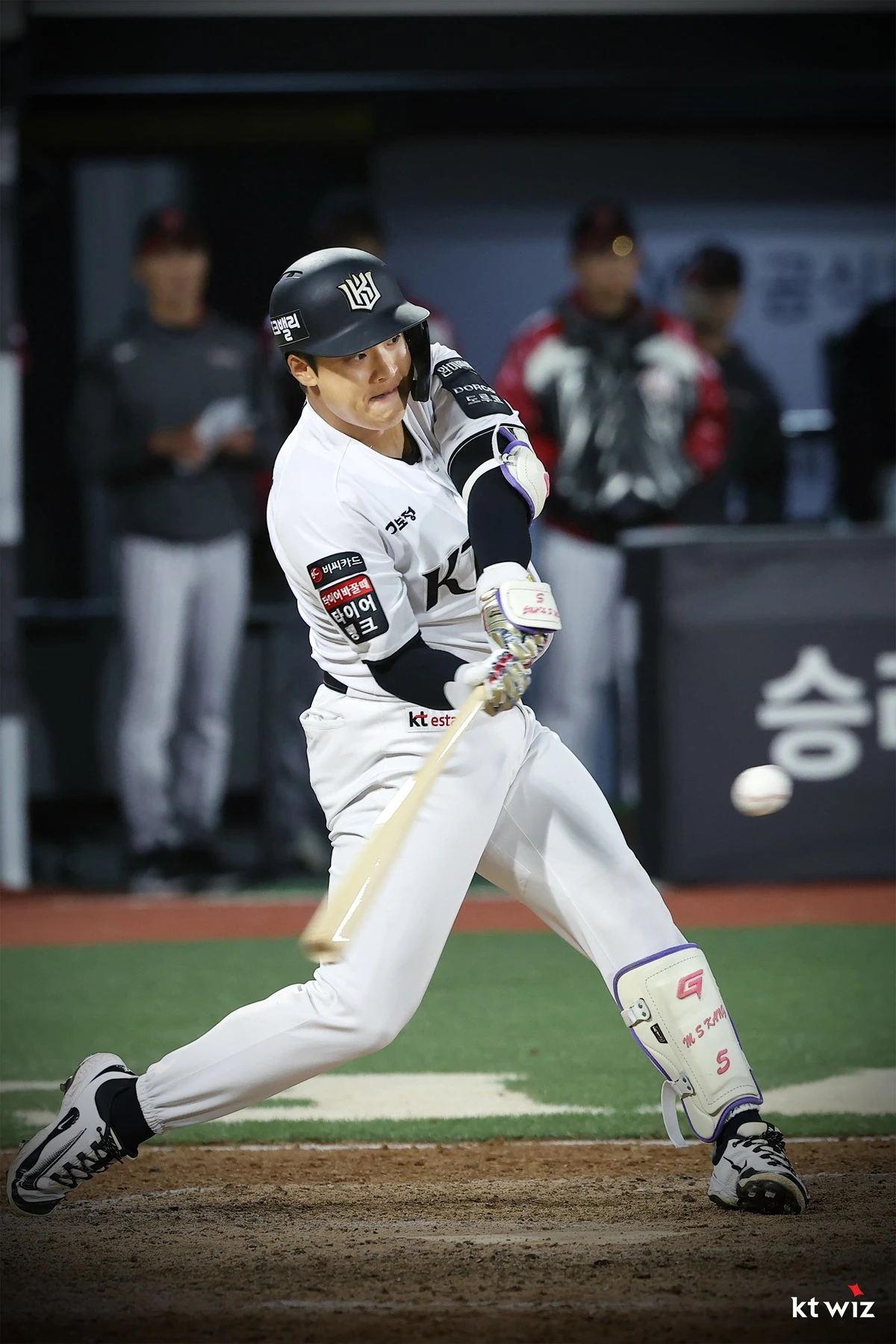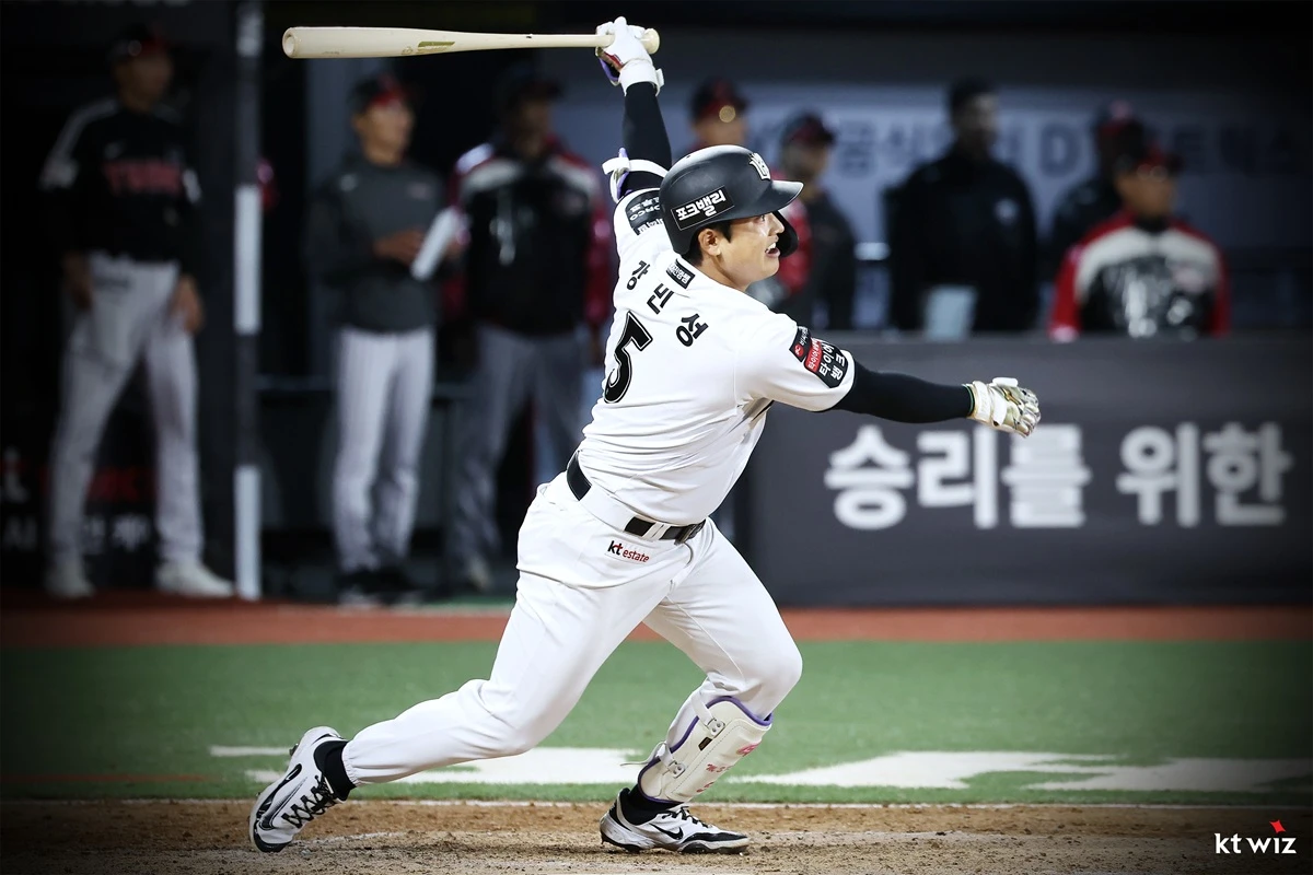 (엑스포츠뉴스 수원, 김근한 기자) 끈질겼던 디펜딩 챔피언을 한순간 무너뜨린 한 방이었다. KT 위즈 내야수 강민성이 데뷔 첫 끝내기 안타로 팀 단독 선두 수성을 이끌었다.