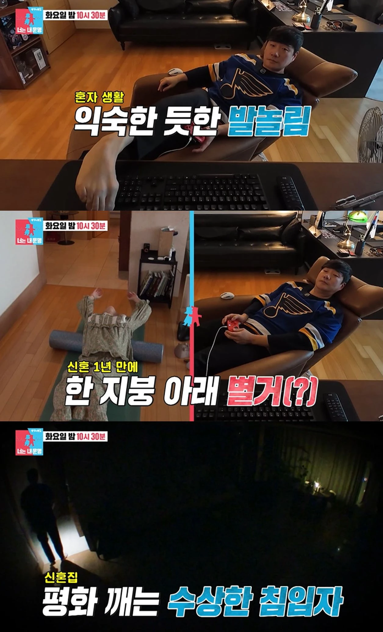 이어 공개된 신혼 생활. 두 사람은 카메라 앞에서도 자연스럽게 스킨십을 하며 '신혼부부'만의 분위기를 보여줬다. 그러나 이내 배성재는 방으로 들어가 발로 컴퓨터를 조작했고, 김다영은 거실에서 혼자만의 시간을 보냈다. 제작진은 '신혼 1년만에 한 지붕 아래 별거?'라며 심각함을 강조했다.