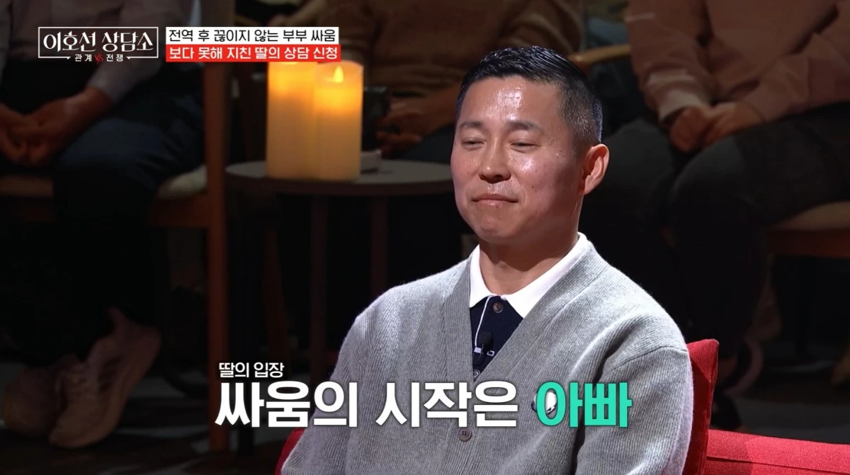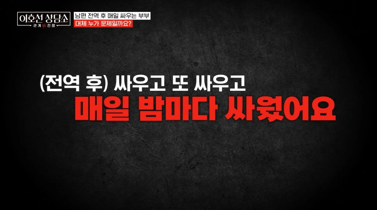 갈등의 시작은 남편의 전역이었다. 새벽에 나가 밤늦게 들어오던 남편이 8시에 출근하고 6시에 퇴근하는 루틴을 갖게 된 이후, 아내와의 싸움이 잦아진 것이다.