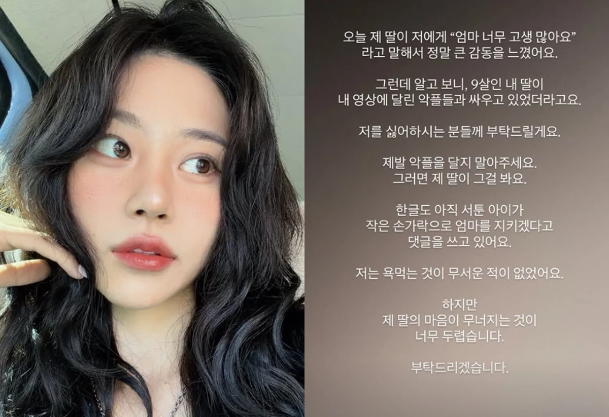 그는 "근데 알고 보니 9살인 내 딸이 내 영상에 달린 악플들과 싸우고 있었더라"고 털어놔 안타까움을 자아냈다.