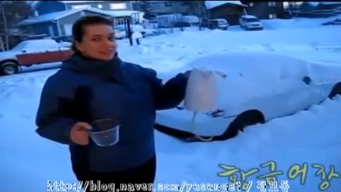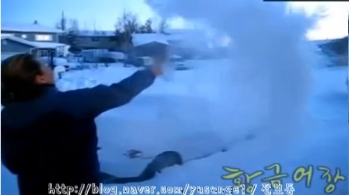 이 영상에는 추운 나라에 사는 주민이 커피 포트에 담겨져 있는 뜨거운 물을  공중에 뿌리는 장면이 담겨 있다.