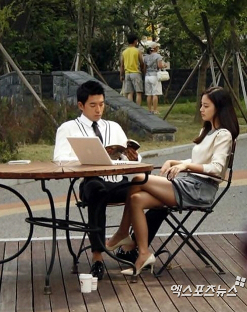 공개된 사진 속 김태희는 CF 촬영장에서 짧은 팬츠를 입고 남자 모델과 앉아 있는 모습이다.