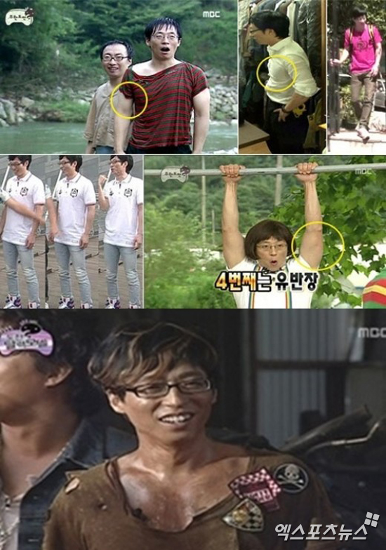 공개된 사진은 유재석의 방송 출연 모습 중 은근히 그의 몸매가 드러난 장면들을 모아 캡쳐한 것. 유재석은 다소 마른 몸의 과거에 비해 다부진 팔뚝과 탄탄한 잔근육으로 반전몸매를 만들었다.