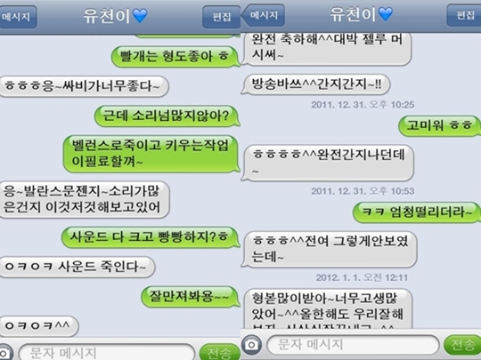 문자에서 두 사람은 일상의 평범한 대화를 나누거나 방송에서의 모습을 모니터해주는 등 돈독한 애정을 과시하고 있다. 특히 김재중은 멤버인 박유천을 '유천이♥'라고 저장해 놓은 모습이 눈길을 끌었다.