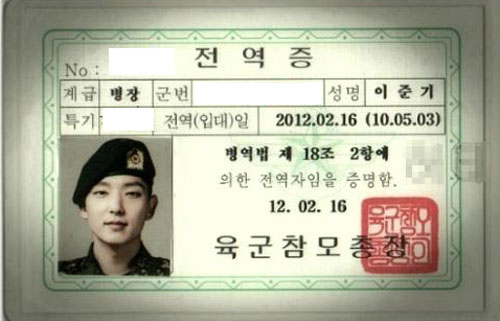 해당 사진은 얼마 전에 전역한 이준기가 육군참모총장으로부터 받은 전역증으로, 현역으로 국방의 의무를 마치고 제대했음을 증명하고 있다.