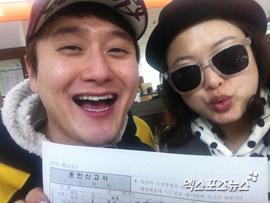 김원효는 5일 오후 자신의 트위터에 "저희 오늘 혼인신고 했어요. 우리 처음 만난 날 혼인신고해서 더욱 뜻 깊은 날. 그동안 정식부부가 아니었음에도 불구하고 잘 살고 있었답니다. 이젠 더 잘 살아야겠죠?"라는 글과 함께 사진 한 장을 게재했다.