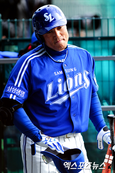 [엑스포츠뉴스=잠실, 권혁재 기자] 17일 오후 잠실야구장에서 열린 '2012 프로야구 시범경기' LG 트윈스와 삼성 라이온즈의 경기에서 9회초 LG 리즈에게 삼진을 당한 삼성 이승엽이 덕아웃에 들어와 멋쩍은 표정을 짓고 있다.
