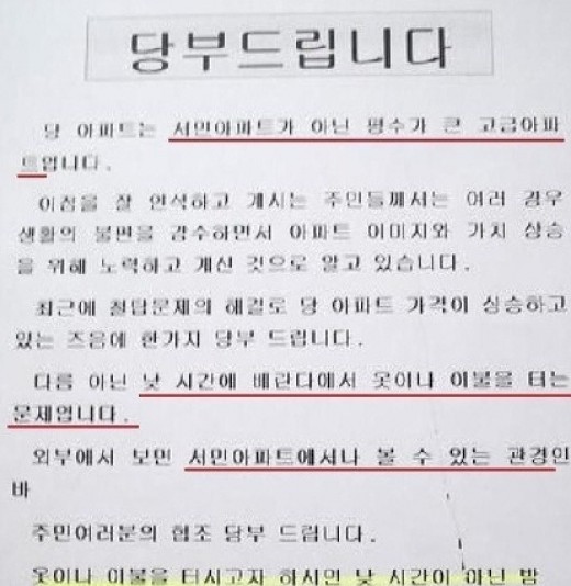사진 속의 글에는 '우리 아파트는 서민아파트가 아닌 평수가 큰 아파트입니다'라는 문장으로 시작되고 있다.