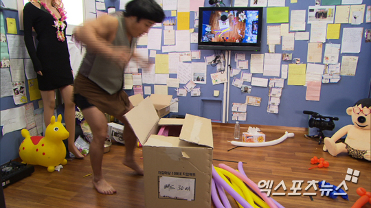 택배와 마주한 김병만은 순간 놀라며 넘어졌고, 눈치가 빠른 이수근은 동물적 감각으로 위험을 감지하고 두 방 사이의 개구멍을 단단히 고정하며 병만을 나 몰라라 해 웃음을 자아냈다.