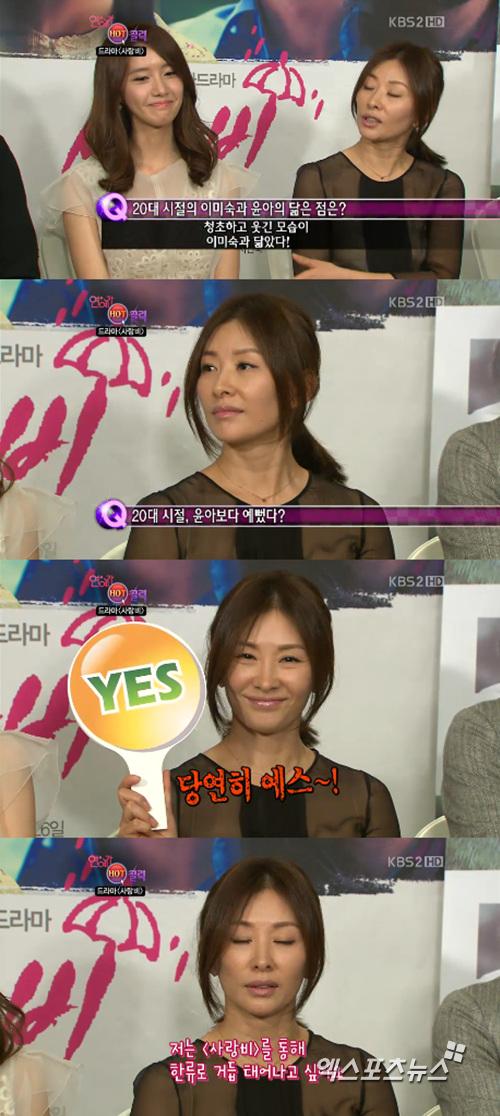 [엑스포츠뉴스=방송연예팀 원민순 기자] 중견 연기자 이미숙이 20대 시절 소녀시대 윤아보다 예뻤다고 밝혔다.