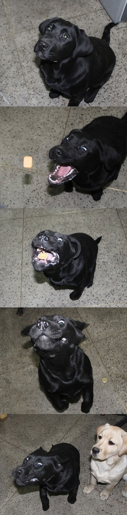이 게시물에는 주인이 주는 건빵을 얌전히 기다리고 있다가 건빵이 던져지는 즉시 혀를 길게 빼고 눈을 크게 뜨고 필사적으로 건빵을 먹은 강아지의 모습들이다.